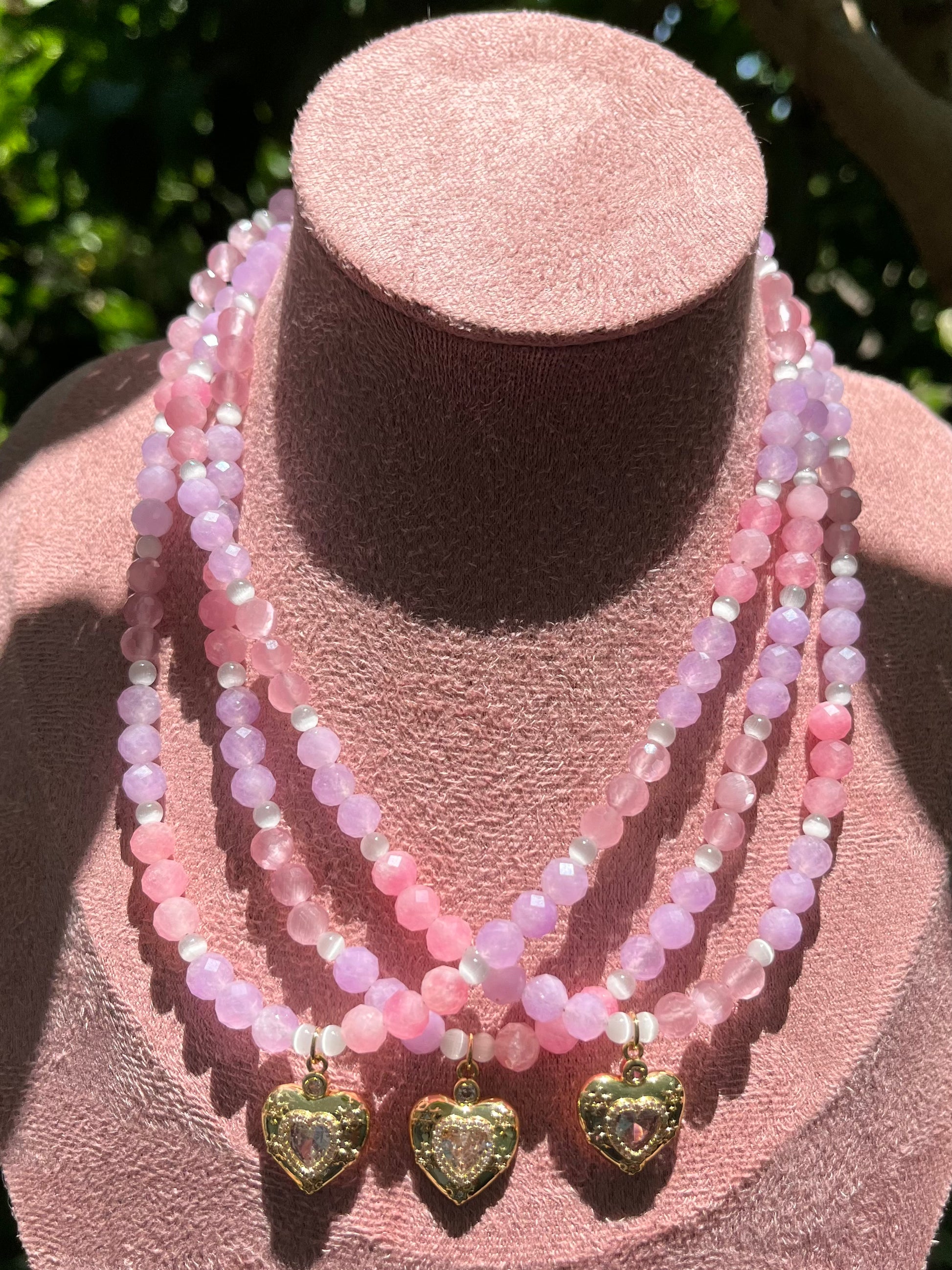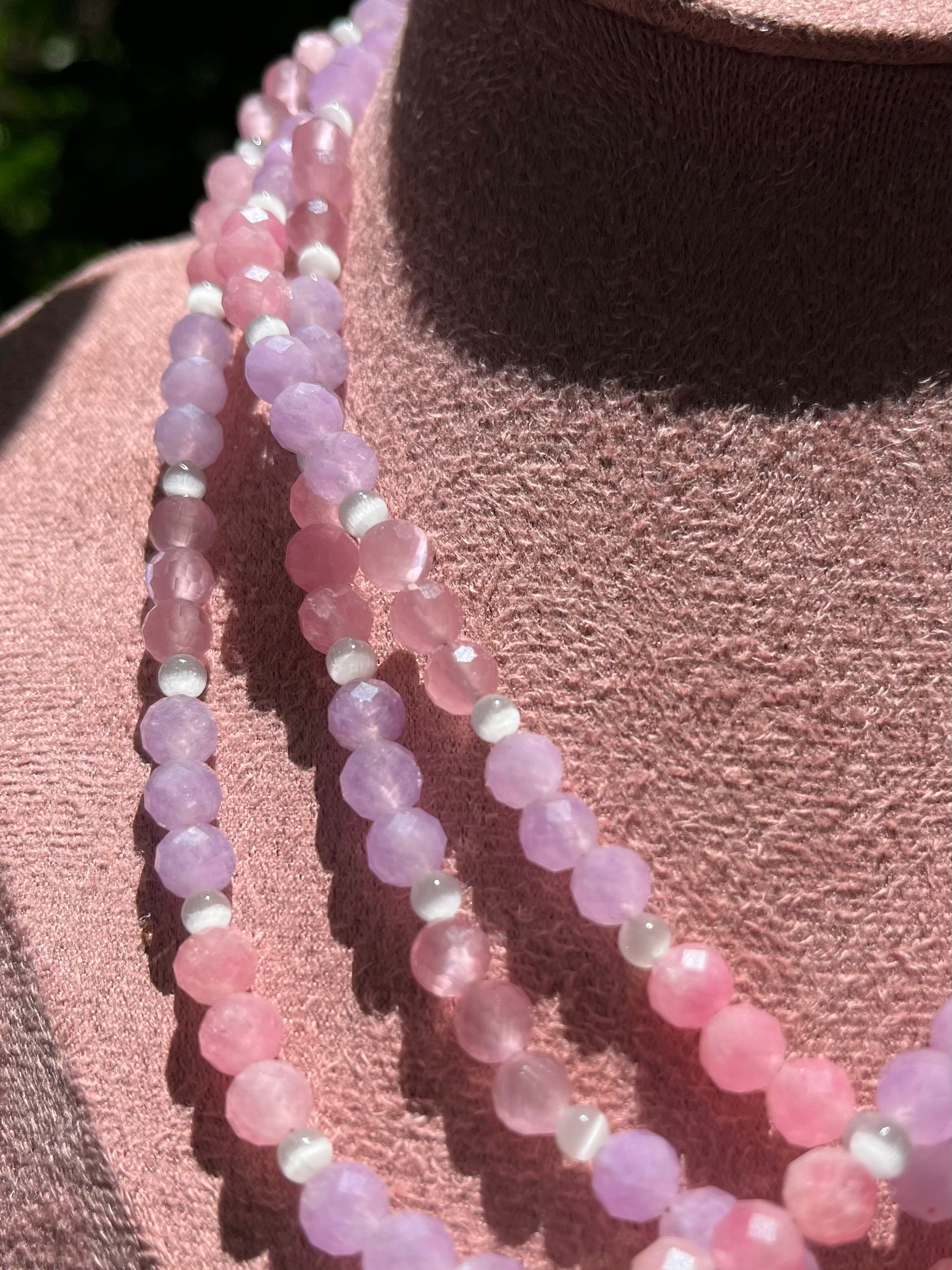 Amamos, amamos, amaaaamos nuestro collar Arrullo de Estrellas esta bellamente elaborado con cuarzos naturales como lo son: kunzita, ojo de gato rosa, selenita y ópalo rosa. Un mix geológico perfecto para proteger y equilibrar nuestra energía espiritual.