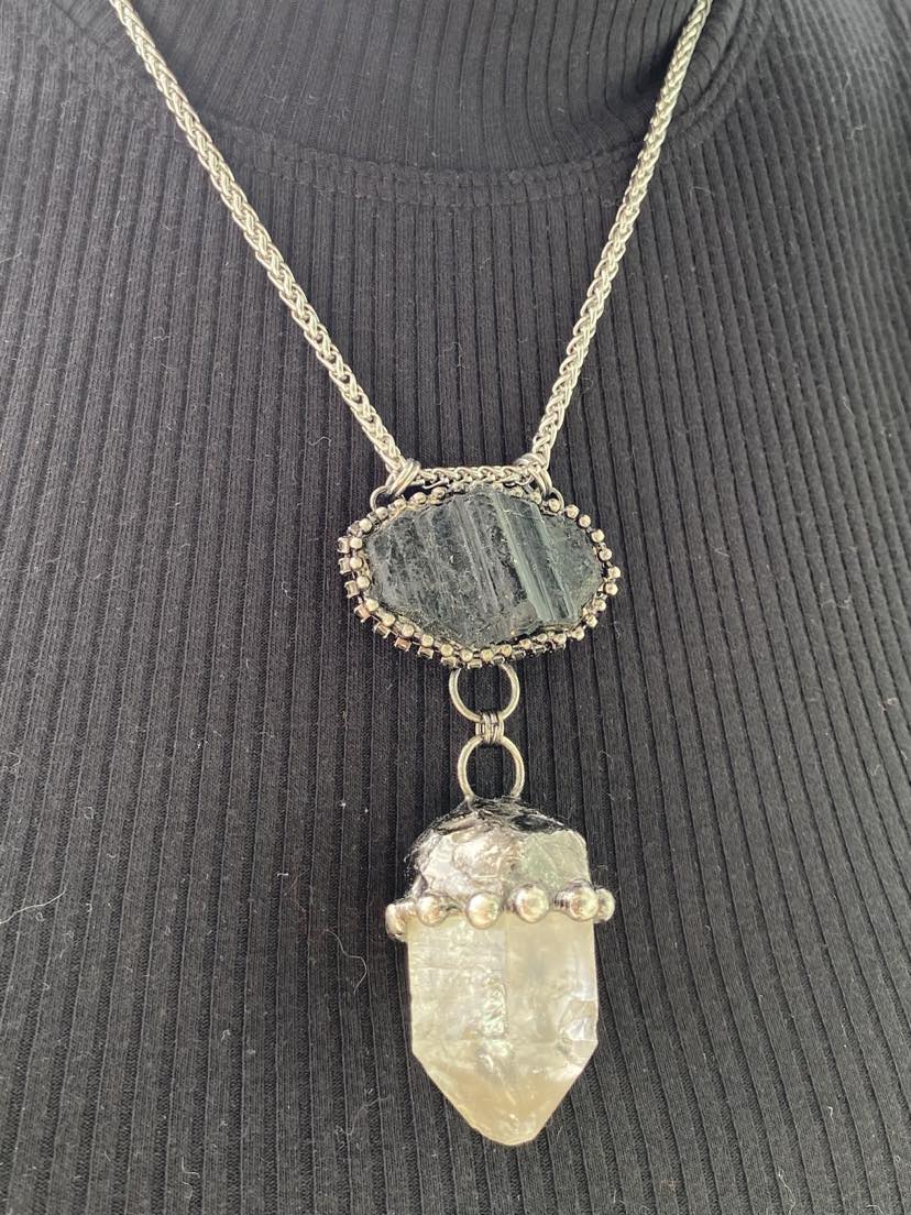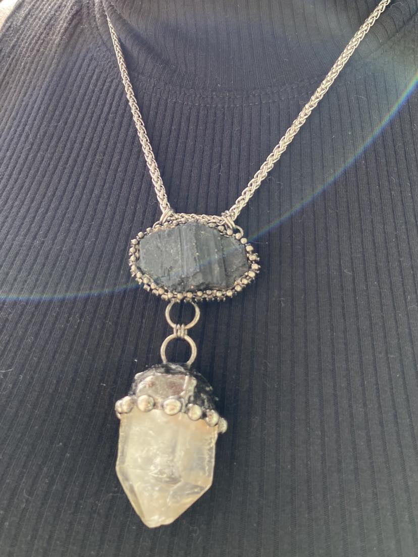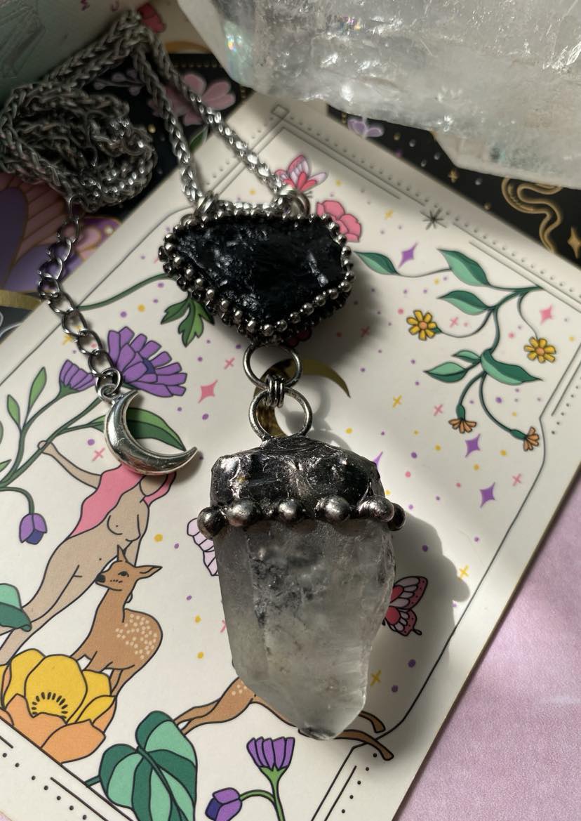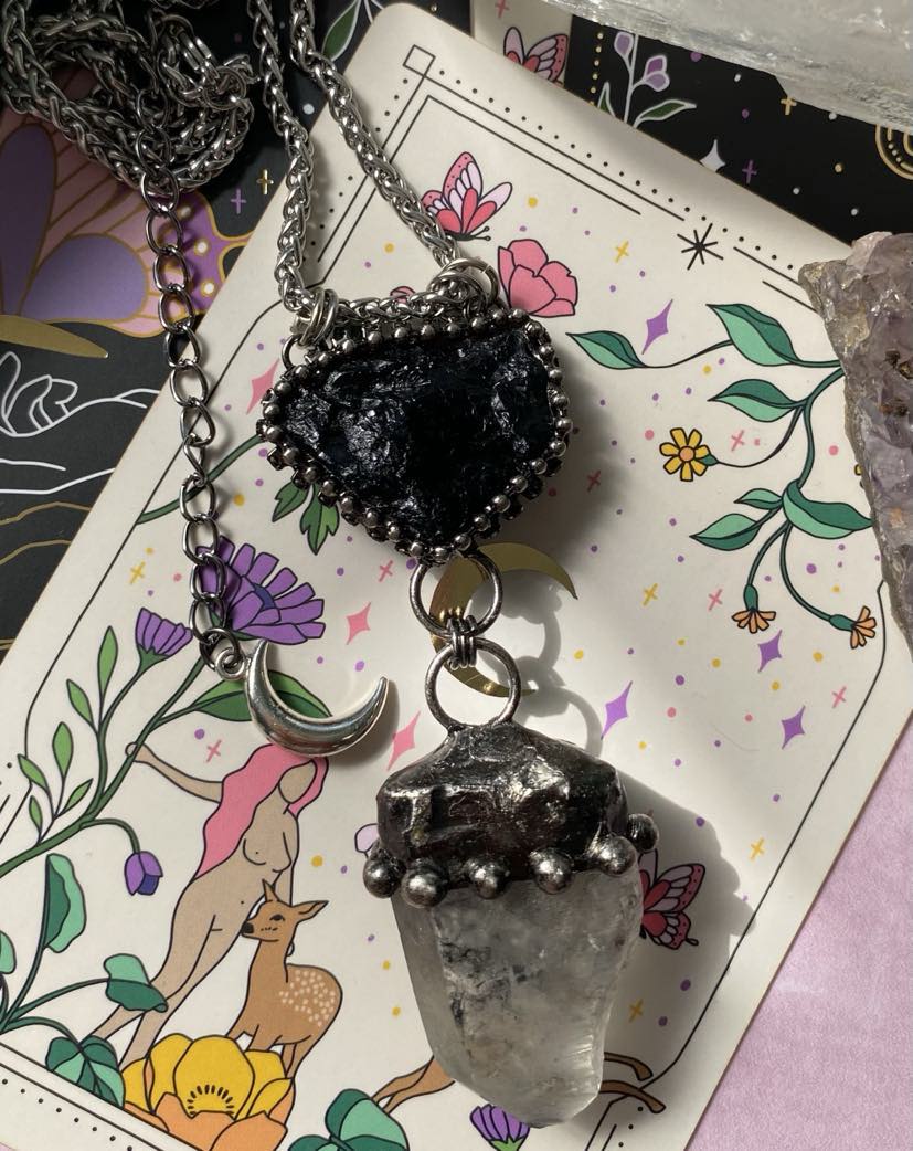 ¡Si eres fan de los accesorios too much esto sin duda es para ti! Elaborado con turmalina negra rustica acompañado de zirconias negras al rededor, con una punta de cuarzo cristal rustico.