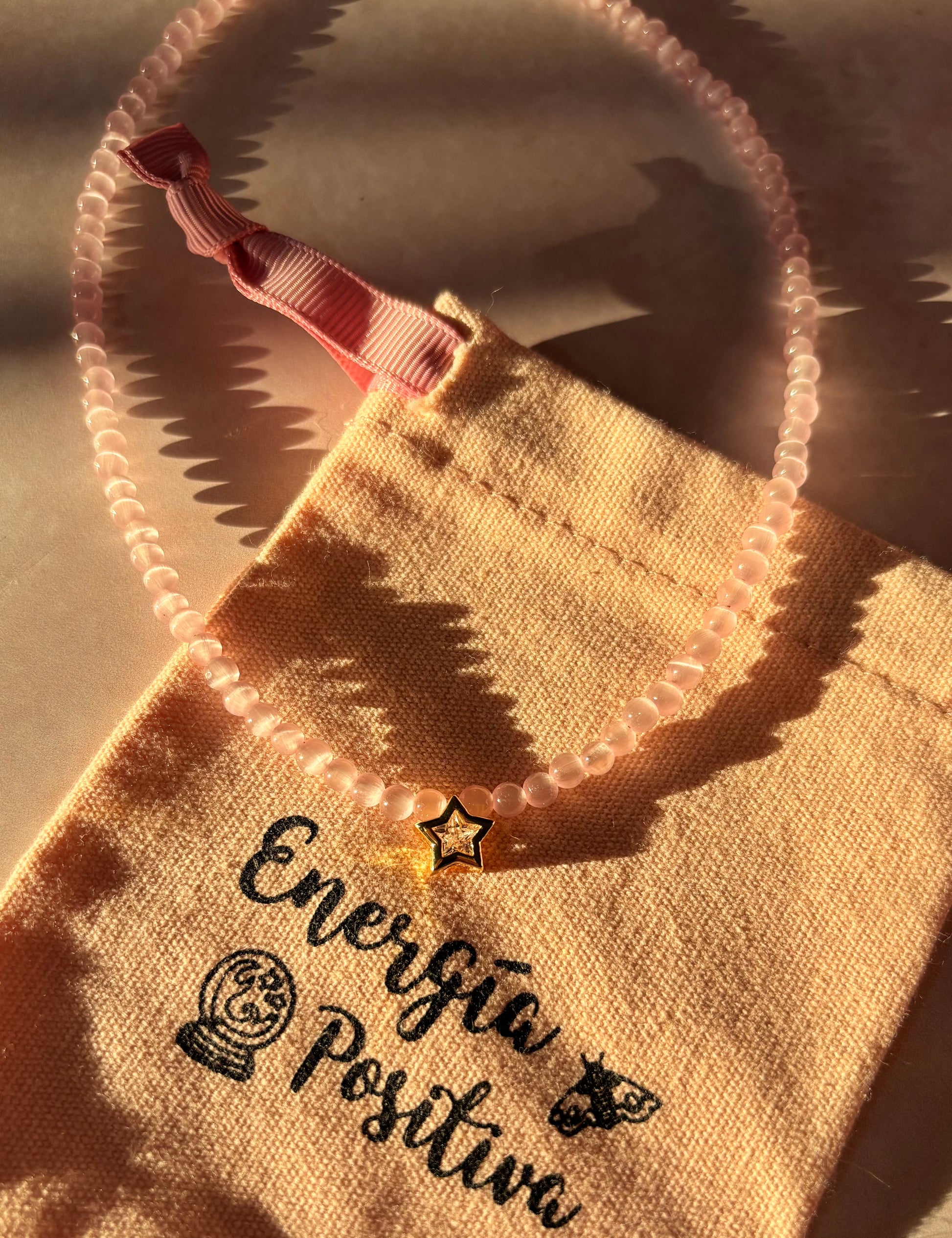 ✋ Collar elaborado a mano con amor con cuarzo ojo de gato rosa y un pequeño de circonía en forma de corazón.